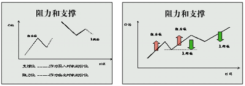 當外匯市場中賣方力量超出買方力量,價格向上勢頭受阻,調頭向下,形成一個波峰,這一價位稱為阻力位。當買方力量大于賣方力量,價格受到支持向上反彈,形成一個波谷,這一價位稱為支撐位。在上升市中,之前的最高價往往會成為阻力位。在下跌市中,之前的最低價往往會成為支撐位。