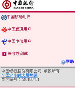 開通手機銀行(理財版或貴賓版)后,請通過手機登錄中國銀行手機銀行地址“mbs.boc.cn”(圖1),進入選擇運營商頁面。