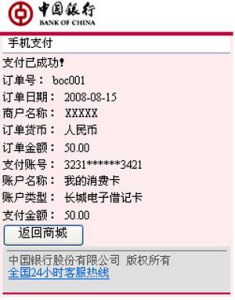 頁面顯示支付成功,以及支付的明細信息,請點擊“返回商城”回到商戶頁面(圖16)。